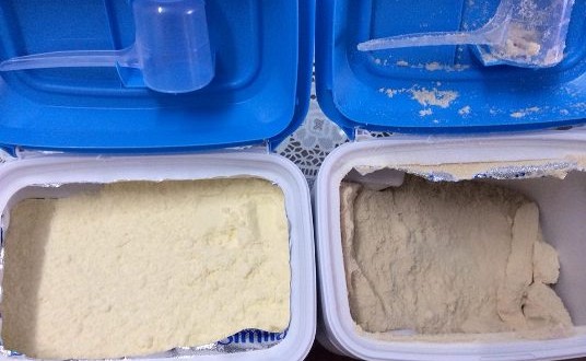 Sữa Enfamil hàng giả sẽ có màu cháy xém (bên phải); sữa Enfamil thật sẽ có màu vàng nhạt (bên trai)